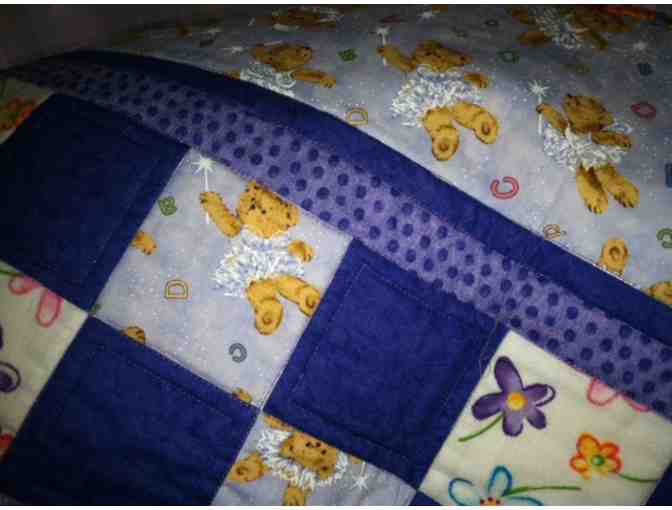 This beautiful and so soft handmade quilt would make a great gift. The color scheme is purple hues, bright flowers, and dancing bears. Measures approximately 3' x 4'.