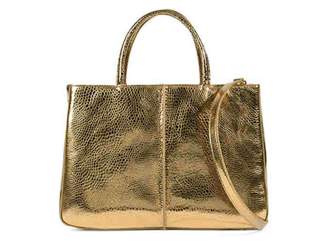 The perfect satchel bag fit for both work or play. This genuine leather handbag measures 12"W X 9"H X 3.75" D with 5" drop handles and a 24" removable strap. Lined in red-cotton twill, there are two large pocketed areas with a zipped section separating them. There's a place for your cell phone inside and an additional zippered section. The gold-toned hardware perfectly accents this beautiful bag's mirrored, exotic-copper finish.