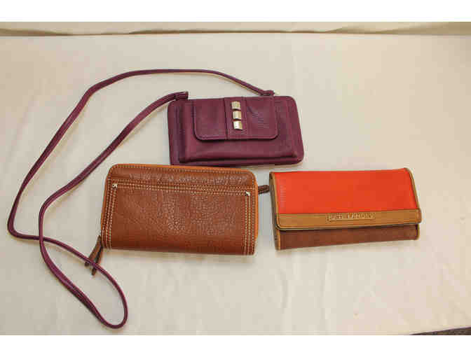 A purple-studded wallet with strap, an orange and tan Kate Landry wallet, and a saddle-brown zipper case, all made from synthetic leather--to hold and carry whatever you need, whenever you need it.