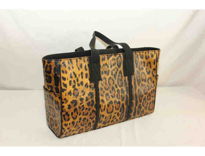 Fun and funky, this synthetic leather tote is the cute carryall you've been looking for. Perfect for spring, it can go from the board room to the beach. There's a snap closure on top, end pockets, and some inside pockets that will keep your belongings organized. Tote measures 10 1/2" H X 16" W.