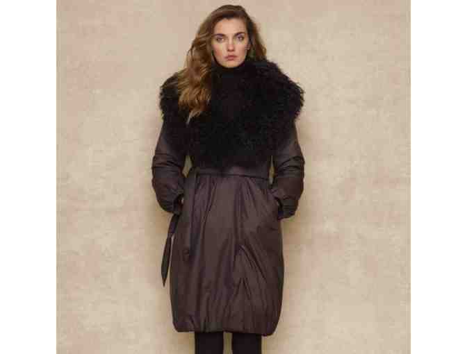 Glamorous, classic, and warm, this down-filled design from Ralph Lauren Ralph Lauren features a removable shawl collar adorned with silky shearling. It is black and in size Medium.
