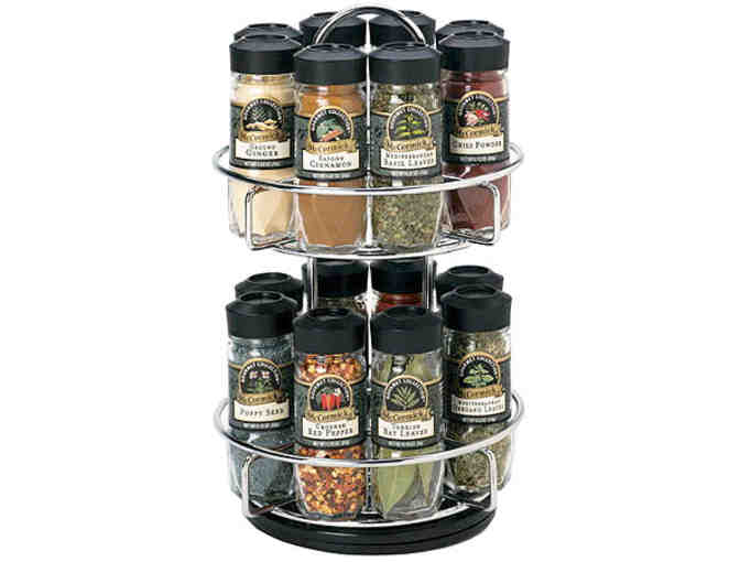 A chrome two-tier spice rack for the adventurous cook. It's filled with 16 gourmet spices and herbs to inspire you; wonderful meals start here. The rack fits comfortably on your countertop and measures 12.34” x 7.57” x 1.59”.