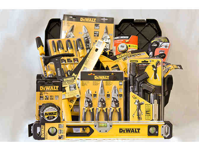 A sturdy detachable two-tier tool kit with the following items packed inside: 25' tape rule, box beam level, 15" blade saw, 3-in-1 tripod flashlight, assorted pliers, hammer, 10-screwdriver set, retractable knife, aviation snips, ratcheting readywrench, all-in-one laser level, 8-piece locking hex key set, a 6" rapid return bar clamp and an interchangeable nail set.