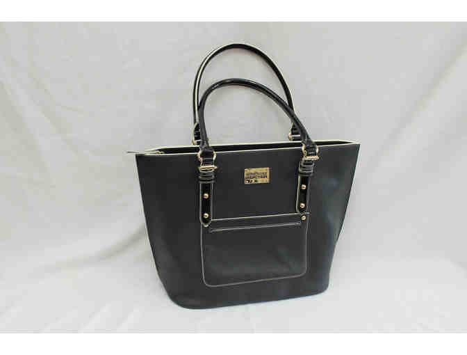 A black faux-leather tote bag with patent handles, zipper top, and white-stitched trim will keep all your essentials smartly tucked away. Bag measures 12" X 18".