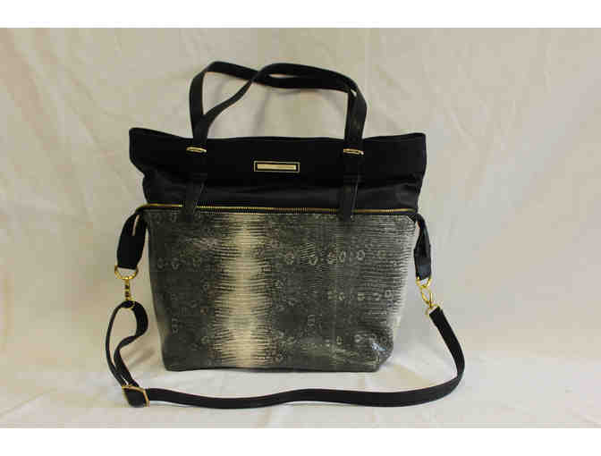 A large tote with snake-like bottom and zipper detail makes this smart bag both fun and practical. It features goldtone decorative trim and a long detachable strap. Bag measures 14" X 16".