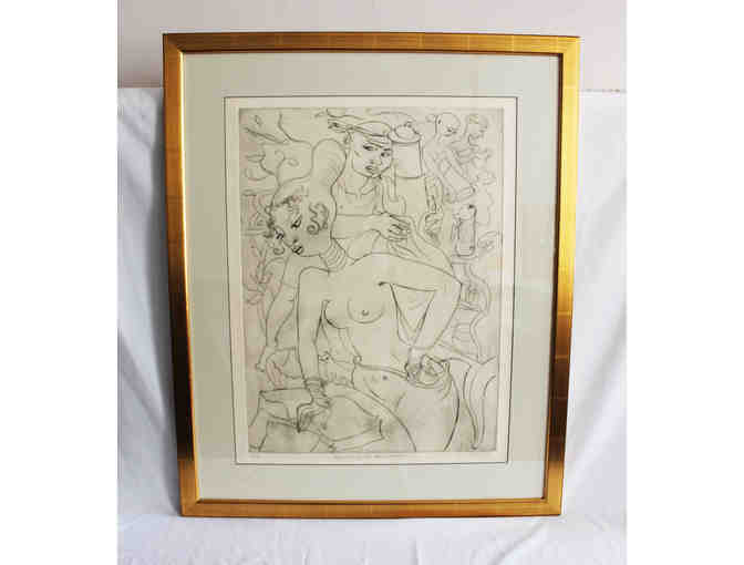 Limited edition etching titled "The Queen of Sheba Bakes a Cake" hand printed by the artist on 100% rag paper. This piece is double-matted, beautifully framed in a gold leaf frame, and measures 34" X 28". Ms. Channing studied at RISD, Atelier 17 in Paris, and with John Sparks at MICA.