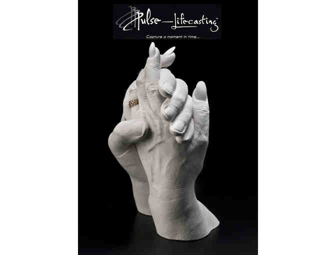 Professional three-dimensional lifecasting of a pair of hands--actual size. It can be a pair of one person's hands, or one hand from each of two people. Includes casting session and final sculpture made in casting stone with finish of your choice, mounted on a black-wood base. Please check the website for creative ideas and more details about these unique and artistic creations.