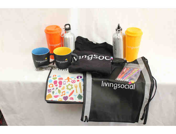 A fun package to remind you of all the great experiences Living Social has to offer. Package includes two coffee mugs, two 16 oz. tumblers, one wine tool, a package of six colored pens, a t-shirt, two silver water bottles, a knapsack, a tote bag, and a re-useable shopping bag.