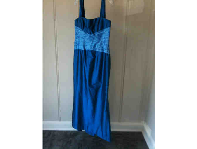 You'll be a smashing guest at the wedding in this simple but dressy blue silk gown by Marissa Baratelli. It has detachable straps for an even more daring look. Dress is size 12 and there are no exchanges.
