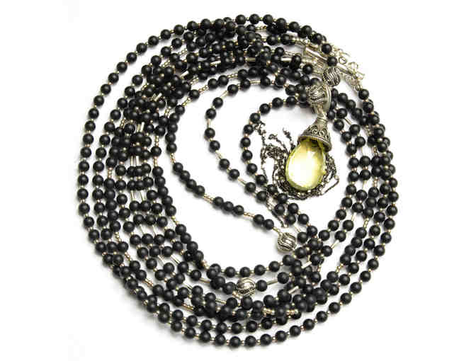Smashing onyx and sterling beads with lemon topaz drop in four dramatic strands--longest 29" to shortest 23". This is a one-of-a-kind piece by Andrea gems.