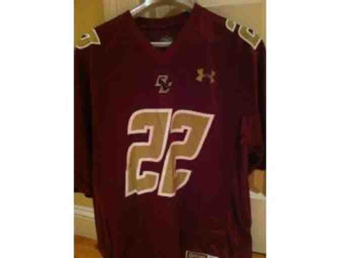Football Jersey autographed by Natick native, and nationally known football player, Doug Flutie. This jersey represents his college team Boston College (BC) where Doug had much success prior to playing in the NFL. Doug is not only an excellent athlete, but also a wonderful role model who has worked to create awareness about Autism.