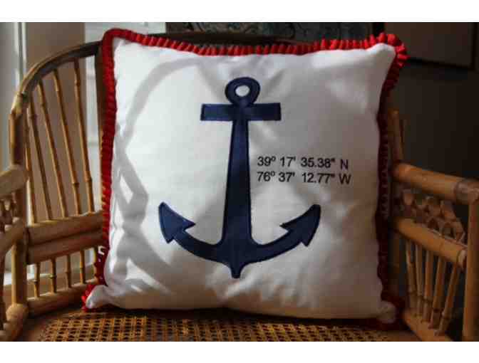 A navy blue anchor applique on a 18" white pillow with red welt, all beautifully crafted around a poly insert, with a zipper finish. The latitude and longitude of Baltimore embroidered on this custom pillow will bring a smile to the faces of your nautically inspired friends.