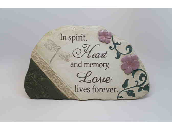"In spirit, Heart and memory, Love lives forever." This inspirational stone can be hung or placed in your garden. It is a precious reminder that love stays with us forever.