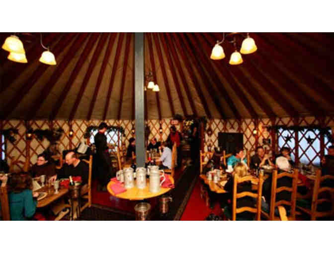 A baby grand piano in the yurt provides live music as your party gathers around the long wooden tables laden with glowingt candles and pewter dinnerware.