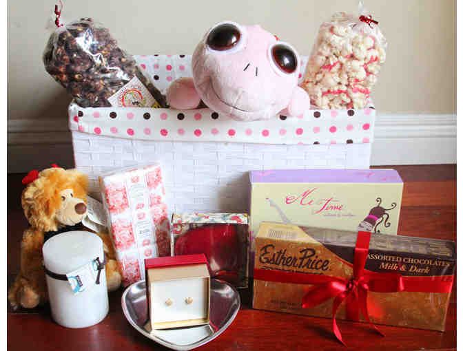 The "Love you" basket contains a red alabaster heart shaped paperweight, pewter heart dish, soft plush teddy bear with heart antennae, love bug ladybug, fancy soaps, note cards, gourmet popcorn, Monet faux diamond heart earrings, candle, box of chocolates, and rhinestone encrusted picture frame.