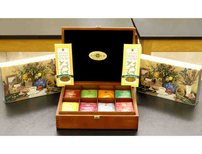 The black felt-lined dark mahogany-stained tea chest is filled with 8 different flavors of tea bags and makes an elegant presentation, no matter the occasion.