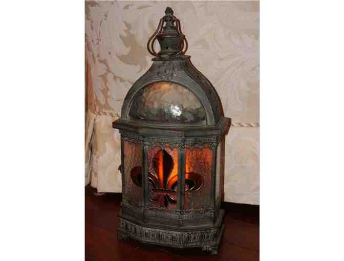 The handcrafted piece stands 24 inches tall and features a gold and purple Fleur De Lis symbol on front and back. The top is formed with curved hammer-finished glass panels that cast a warm glow at night. The metal lantern body is finished in an aged Verde patina. Also included is a 10 inch tall wax candle that has a flickering LED inside. The battery operated candle has a timer that turns the candle on the same time each day and stays lit for 5 hours each day. The lantern is weather proof and looks awesome at night. Pickup only.
