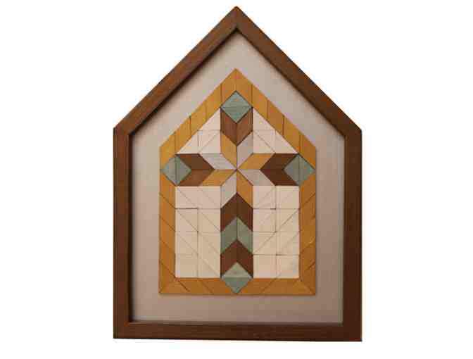 This all wood wall hanging is made from 100 individual pieces. Each piece is hand painted and carefully positioned in place. The dimensions are 15 inches tall by 10 inches wide. The outer frame is finished in a bronze tone.