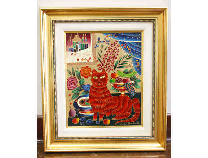 Contemporary in style, the painting features one of his hallmark characters - the red cat - tucked into a winter landscape. Gorbachev's work is represented in permanent collections around the world including the Louvre, the Kremlin Museum, and the White House. (Though never out of its original box, the matting in the lower right corner is slightly discolored. Retail value has been adjusted.)