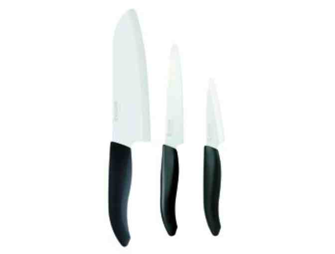 This package includes not one but two knife sets from Kyocera. The first set includes a 6"Chef's Knife, 5" Micro Serrated Knife, and 3" Pairing Knife, the essential tools for any home cook preparing meals daily. The 6" Chef's Knife is an all-purpose knife, the ultimate cutting tool for everyday slicing of fruits, vegetables, boneless meats and fish. The 5" Micro Serrated Knife has a serreated edge that effortlessly glides through waxy skins found on tomatoes or any food with a tough skin and soft middle. The 3" Pairing Knife is ideal for detailed tasks like trimming, peeling, mincing, and creating garnishes.