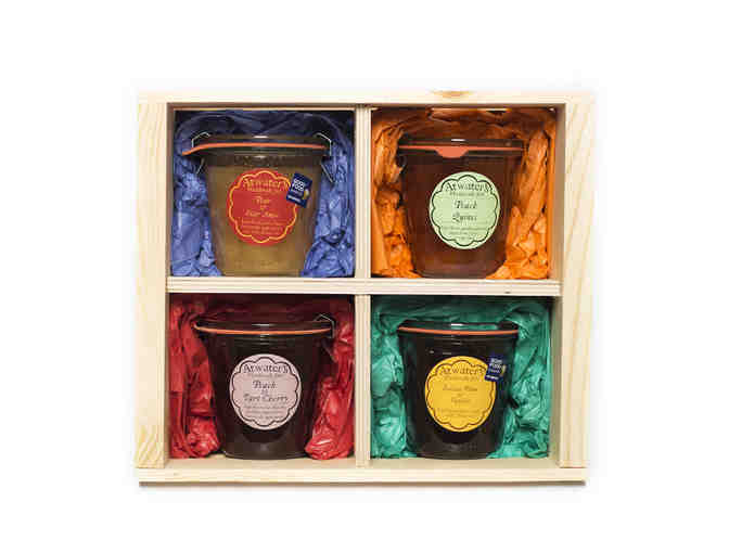 Each hand-made gift box contains four signature Atwater's jams. Every jam is handcrafted in the French preserve style using a traditional copper jam pot and fresh ingredients supplied by local farmers. Flavors include: Winter Reserve, Lemon Honey & Cinnamon, Pear Conserve, and Pineapple Rosemary.