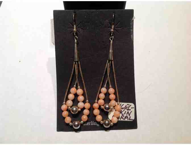 Native American made sterling silver, Heidi bead and angel skin coral earrings. Measures 3 inches.