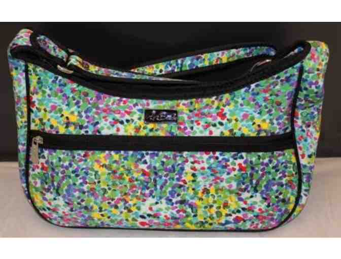 The waterlily bag is reminiscent of a water color by French pointillist painter Georges Seurat. In turquoise, red, yellow, green, blue, and black, it zips closed with a black zipper and also has an outer black zip compartment. The nylon inside is easy to clean and has compartments for cosmetics, pens, notebook and other necessities. Comes with a matching wallet-sized clutch with black wrist strap and black zippers inside and out. Plenty of room for credit cards, with an area for cash and coins. This easy to clean pair will go with everything and look stunning and different on the beach, at the store, on vacation or every day.
