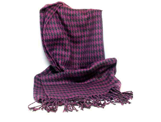 Soft, warm, and just right for those cold days. This is a rectangle scarf in purple and black with black fringed ends from Mozelle in Germantown. The hounds tooth pattern makes it a classic you can wear for years and years.