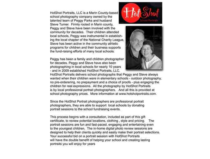 Photographic portrait session in your home or on location with HotShot Portraits. HotShot Portraits is a premier school photography company in Marin County and has done the student portraits at over 20 schools. The professional portrait photographers of HotShot Portraits will conduct the portrait session, pre-shoot consultation and post-shoot review. In addition, if HotShot Portraits is contacted within two weeks of the event an 8x10 custom print (black and white or color) of any image from the portrait session will be included. Additional images are available for purchase at the photographer¿s normal portrait prices, not the school portrait pricing.