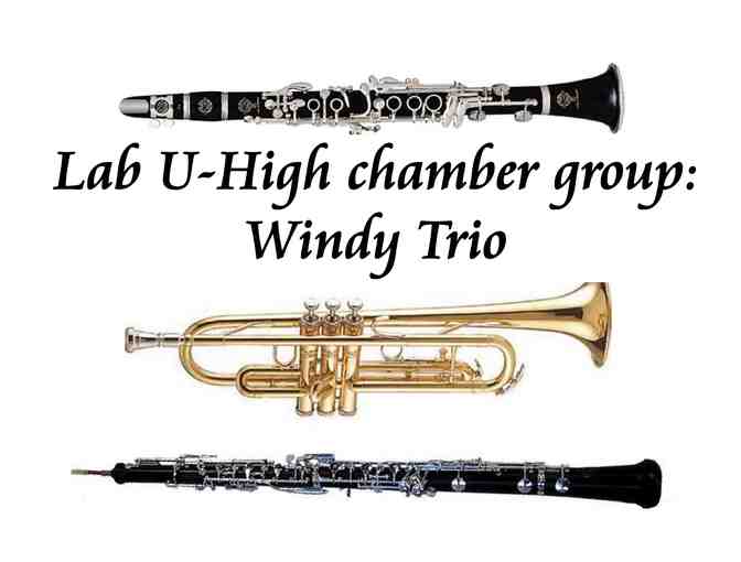 Windy Trio is the Lab U-High chamber group featuring the clarinet, oboe, and flute. This private one-hour concert will set an elegant tone for your event. Musicians Julia Hedges, '16, Nigel Van Ha, and Harry Ni have been perfecting their craft for years. Book them before their Hyde Park Chicago Concert Tour sells out! Due to the popularity of these artists, this concert must be redeemed by May 31, 2014. Open to Lab families only.