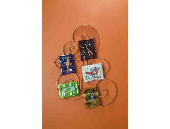 Individually designed fused glass panels on gold-tone swirls describes this unique wall hanging. It measures 24" x16" and is ready to display in your home.