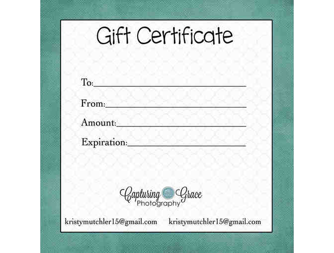 This certificate is good for one full service newborn photo session with Capturing Grace Photography held at the Novato studio.