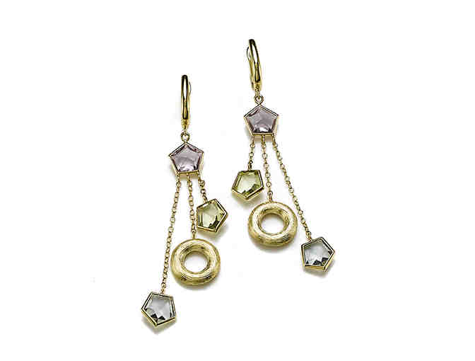 Beautiful 18k gold drop earrings with custom cut multi-color amethyst and quartz, and hand-etched gold sections by Rudolf Friedmann, Inc.
