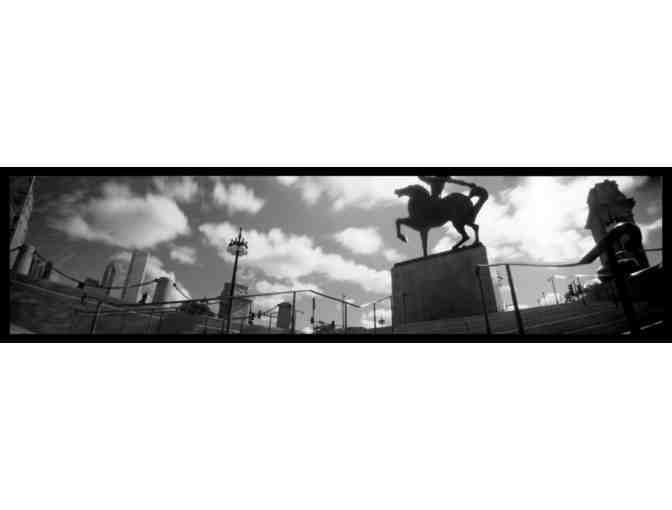 "Pinhole panorama with handmade camera. Picture has 140 degree view. 120 film. Negative is 9 1/2 inches x 2 1/4 inches. Early morning shot of statues, architecture, and sky. Torn out image floated on foam-core to match softness of pinhole."
