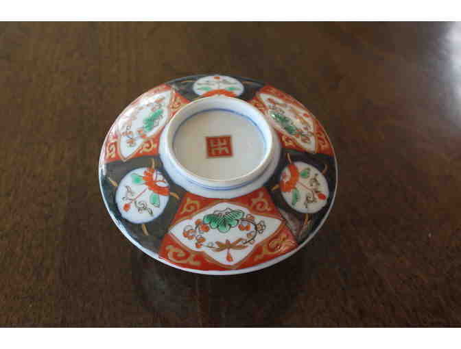 This Imari covered rice bowl is beautifully painted with cover. The bowl features scenic panels alternating in black and red with blue and gold highlights, decoration to the interior and stamped on the top.