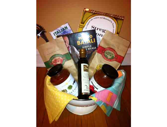 Includes: two types of sauces, two types of pasta, olive oil, two kitchen towels, pasta server, Strega Nona, Molto Batali: Simple Family Meals cookbook, and a big colander. Donated by Stone kindergarten teachers - Joanne Zemenides and Marti McMaster