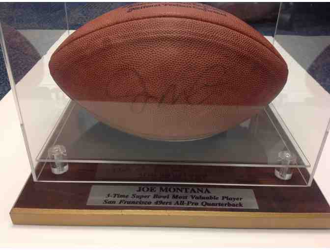 Wilson Official NFL football autographed by Joe Montana in display case. He is a 3-time Super Bowl Most Valuable Player. San Francisco 49ers All-Pro Quarterback.