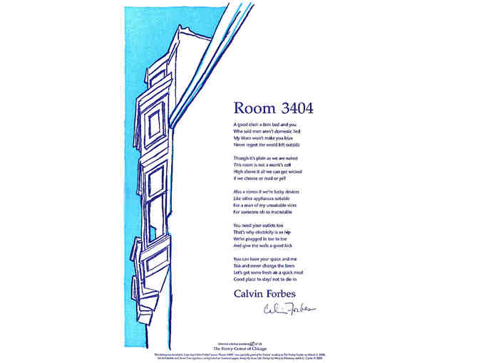 A letterpress broadside (Print), featuring Calvin Forbes' poem "Room 3404" was specially printed for Forbes' reading at The Poetry Center on March 2, 2005.