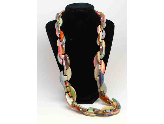 This uniquely beautiful and colorful abstract necklace will look great with many colors.  Take your outfit from ordinary to extraordinary with this necklace, made by Sobral Jewelry in Brazil.