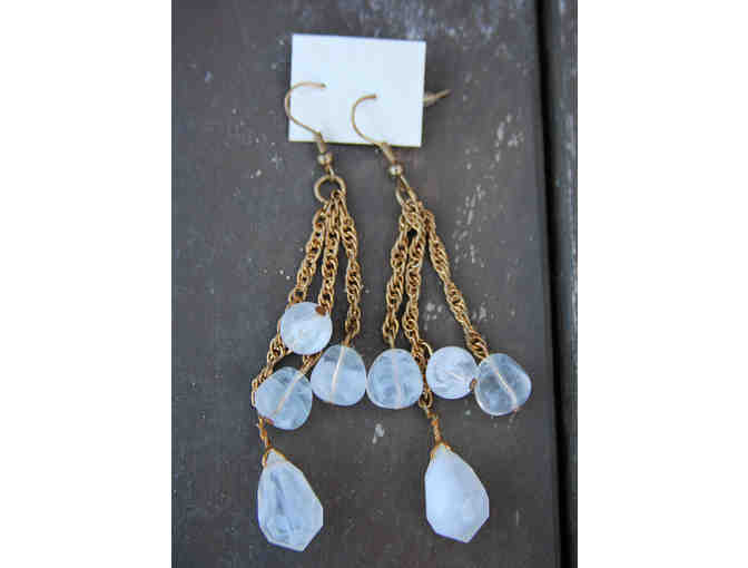 Wear them with a formal dress or wear them with a pair of jeans. These white stone hanging earrings go great with any outfit and any occassion. The earrings have four translucent white stones attached by chains on this chandelier style accessory. You'll get dozens of compliments from these stunning and elegant earrings!