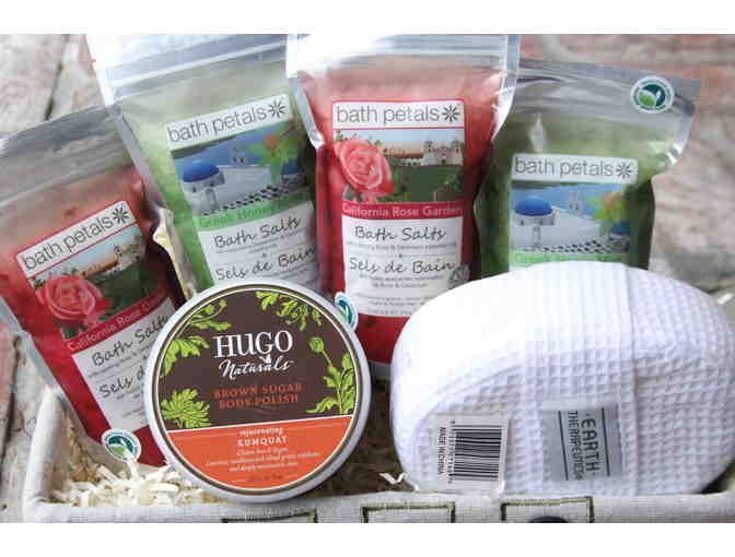 Need some "me time?" This "Time to Relax" Bath Basket includes two Bath Petals bath salts California Rose Garden (11oz), two Bath Petals bath salts Greek Honey Mint (11oz), Hugo Naturals Brown Sugar Body Polish (9oz), and an Earth Therapeutics Loofah Bath Pad. Soak all your stress and worries away with this bath basket!
