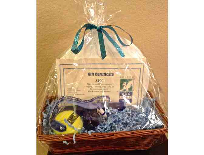 Basket includes $100 Gift Certificate to Folsom Dog Resort, plus a dog frisbee, dog food clip, dog tennis ball toy and a pen.
