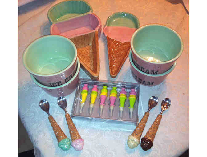 Set comes with 4 bowls, 4 spoons, 1 display tray, 1 sprinkle/topping tray, and a set of 6 icecream candle holder picks.