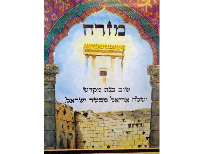 This mizrah in particular features an elegantly framed image of the Beit Hamikdash floating above the wailing wall. Gold accents surround the central text.