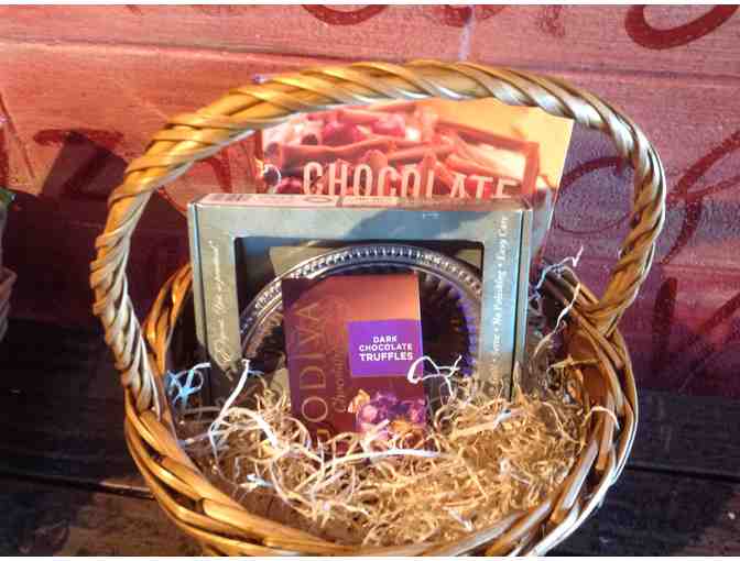 If you are a chocolate lover, this is the basket for you! Make some delicious goodies with the Chocolate cookbook, then serve them on the gorgeous silver serving plat. Godiva chocolates included!
