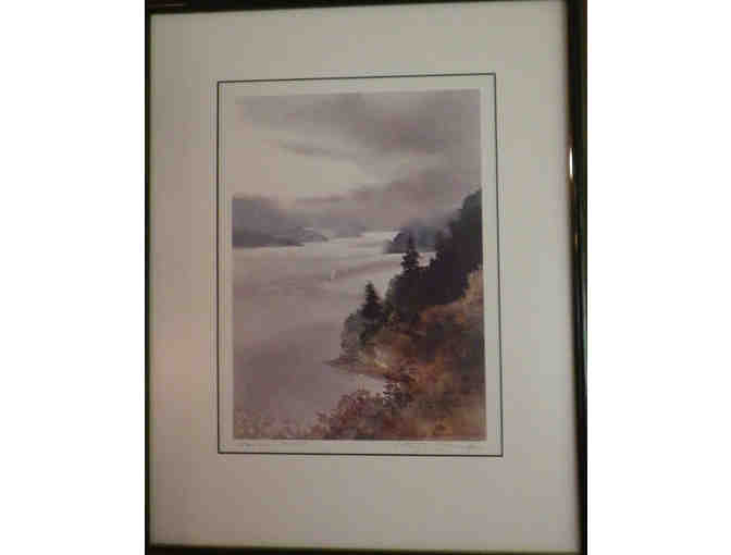"Vashon" 124/950- N. Taylor Stonington C 85 signed personally as well as the signature on the print. numbered limited edition. framed 16 by 20, exposed print 9 3/4 by 12 3/4. view from above of two sailboats barely seen, land on both sides.