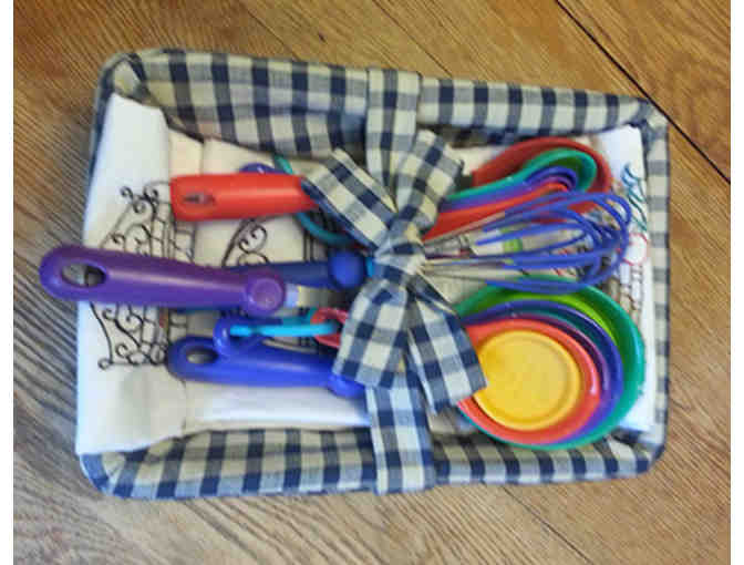 This lovely basket is perfect for stocking the kitchen for a new college student or simply re-stocking your own kitchen. Included with the hand embroidered kitchen towels are measuring cups and spoons, 2 large spoons, a whisk and a spatula.