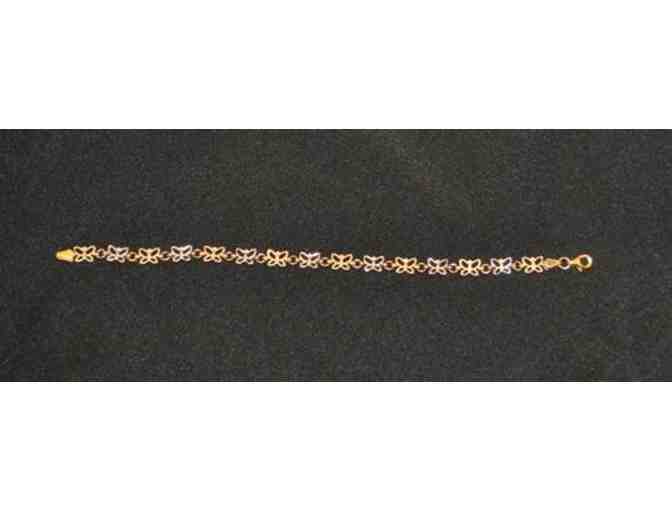 This bracelet is in its original packaging and it stamped 14K from Turkey. The bracelet is 6.5 inches (not including clasp), depicting a row of butterflies, alternating gold and silver color. The butterflies are .25 inches high.
