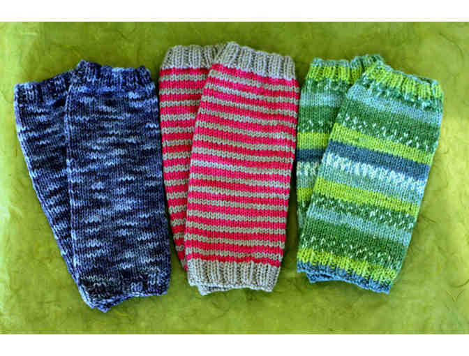 Keep your toddler's busy legs warm with these fun stripey legwarmers. Sized to cover the full legs of a chubby baby to the lower legs of a curious toddler. Handknit by Families Together parent Sara Atkinson from a soft easy care acrylic yarn. Machine wash/air dry.