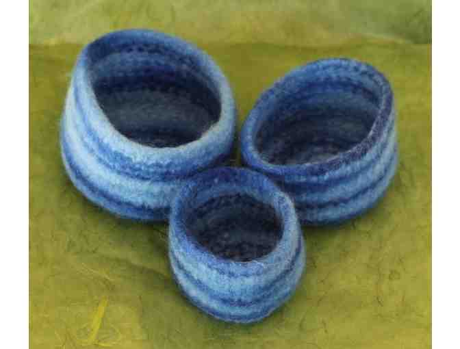 Three (3) blue hand knitted,felted nesting bowls handmade by Families Together grandparent Jane Atkinson.